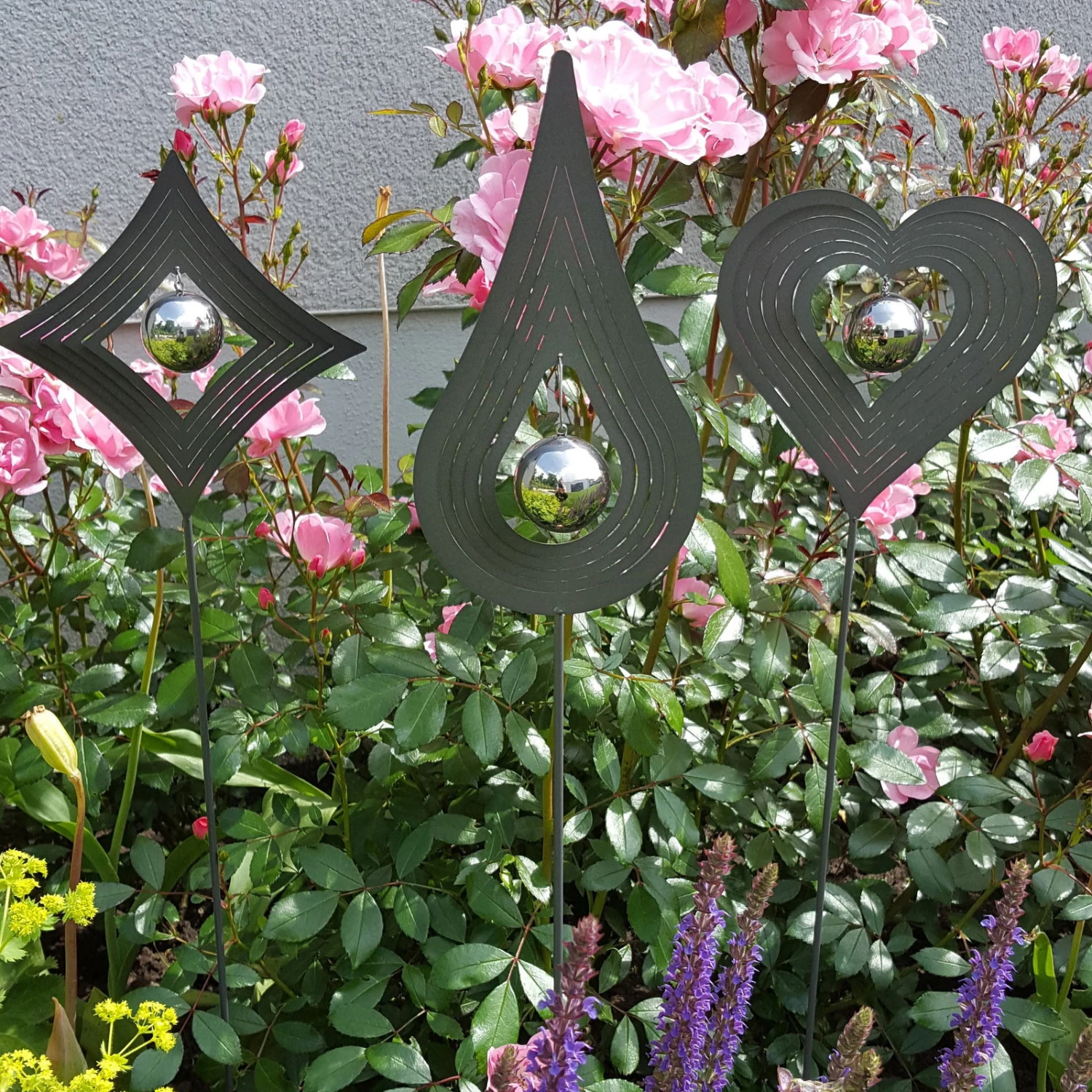 Farbige Blumenbeete werden jetzt noch schöner – mit dem Beetstecker Tropfen aus Stahl. Die wunderschöne Skulptur für den Garten in modischer dunkelgrauer Lackierung mit Edelstahlkugel lässt sich in wenigen Handgriffen in Pflanzenbeete oder Blumenkübel stecken und wird so zu einem echten Eyecatcher.