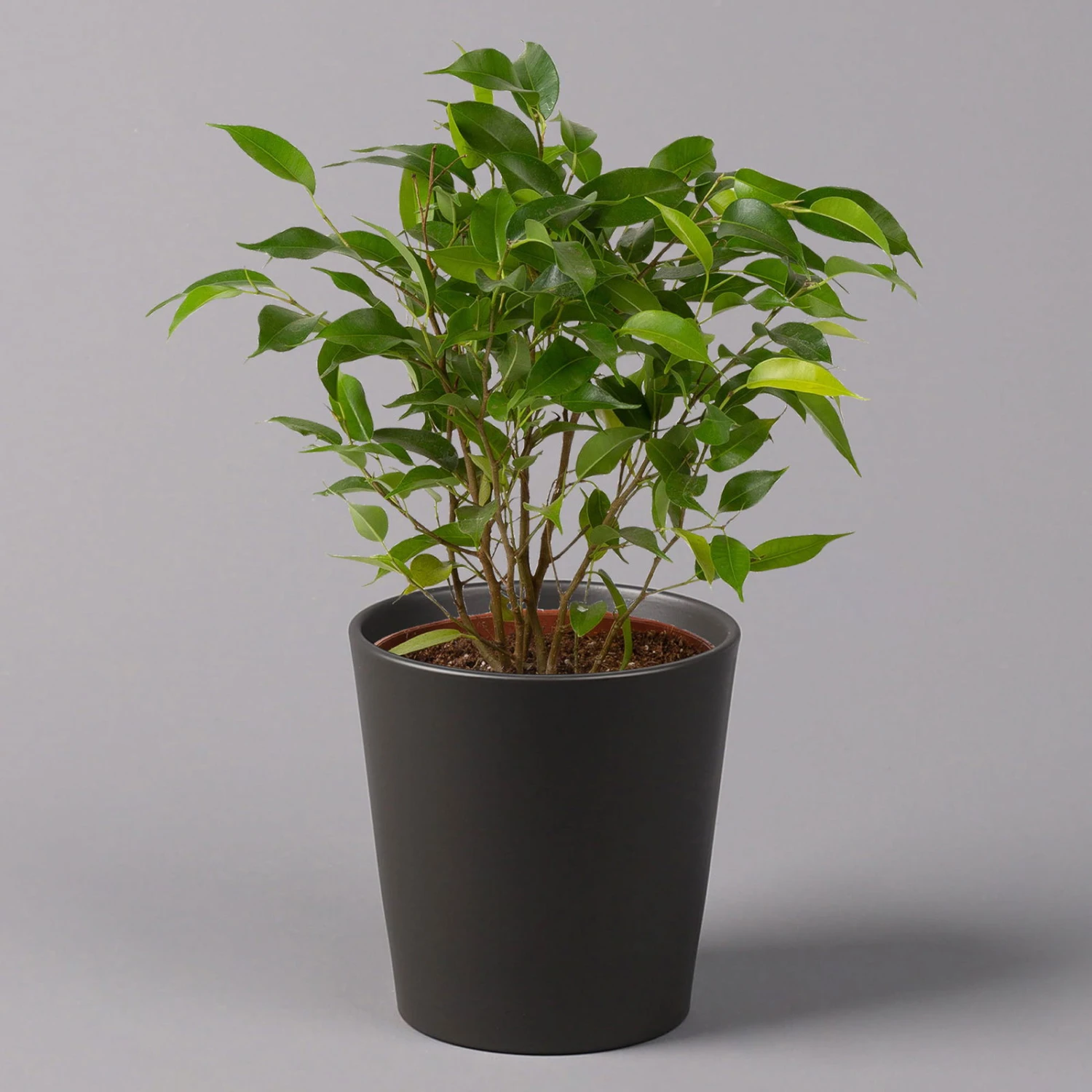 Der Ficus benjamina ‚Natasja’‘ mit seinen dunkelgrünen, glänzenden Blättern ist ein Highlight für jeden Raum. Bekannt ist diese Zimmerpflanze auch unter dem Namen Birkenfeige und besticht mit ihrem buschigen Wuchs und den spitz zulaufenden Blättern. Ihre Birkenfeige macht sowohl im Wohnzimmer als auch im Office eine gute Figur und fühlt sich in hellen sowie halbschattigen Lagen gleichermaßen wohl. Auch für Ihr Schlafzimmer ist der Ficus benjamina ‚Natasja‘ die richtige Wahl, da er Schadstoffe, wie z.B. Kohlenmonoxid abbauen kann. Gießen Sie den Ficus eher sparsam, das Substrat können Sie gerne antrocknen lassen. Im Sommer dürfen Sie Ihre Birkenfeige auch im Freien an einem windgeschützten Standort ohne direkte Sonneneinstrahlung stellen. Achten Sie darauf, dass es der Pflanze nicht zu kalt wird, denn auch im Winter dürfen die Lufttemperaturen im Raum nicht unter 15 Grad Celsius fallen. Bitte stellen Sie Ihre Birkenfeige außerhalb der Reichweite von Kindern oder Hautieren auf, da ihr Milchsaft giftig ist.