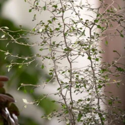 Der Zickzackstrauch (Corokia cotoneaster) mit seinem kleinen oval bis eiförmigen Blättern begeistert mit seinem filigranen Wuchs. Die immergrünen bzw. silbernen Blätter bleiben über das gesamte Jahr an der Pflanze erhalten. Der Wuchs dieser Zimmer- oder Kübelpflanze ist aufrecht pyramidal, die Äste und Triebe haben einen bizarren zickzackförmigen Wuchs. Die Pflanze erreicht eine Höhe von bis zu 2 Metern.